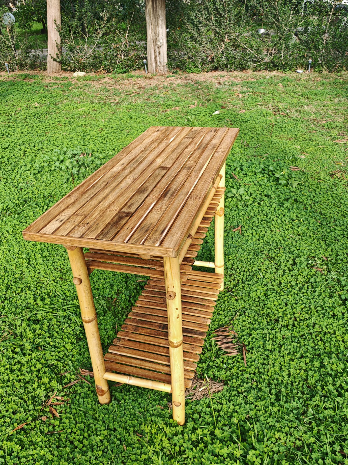 השולחן עשוי מבמבוק טאם וונג חזק ואיכותי. יכול להתאים ליד מיטת שיזוף או עם זוג כסאות מתקפלים. מידות: 41 ס"מ על 46 ס"מ גובה 32 ס"מ. *מגיע מורכב מתצוגה, עבר צביעה במצב מעולה *מתאים למקום מקורה מגשם