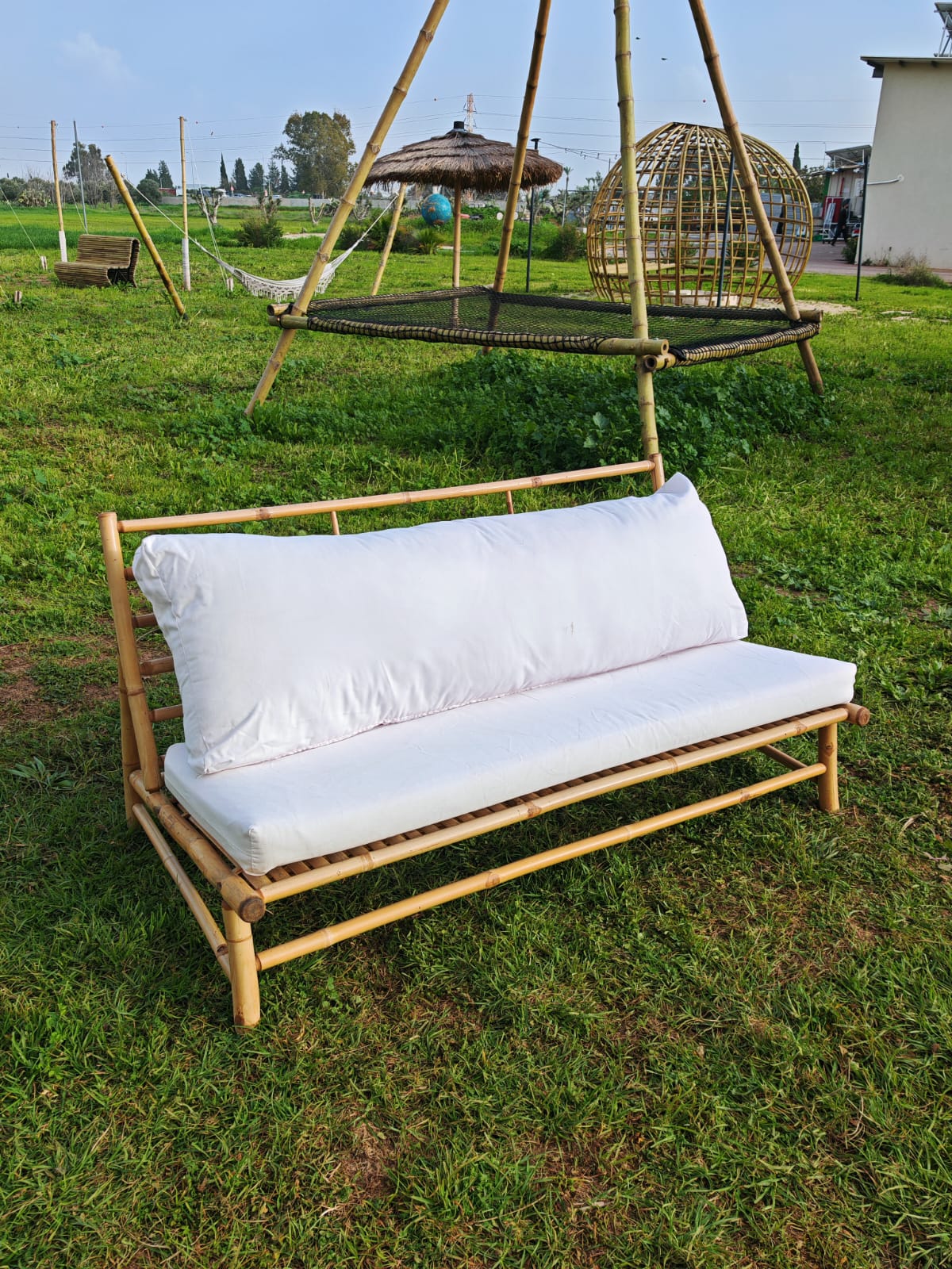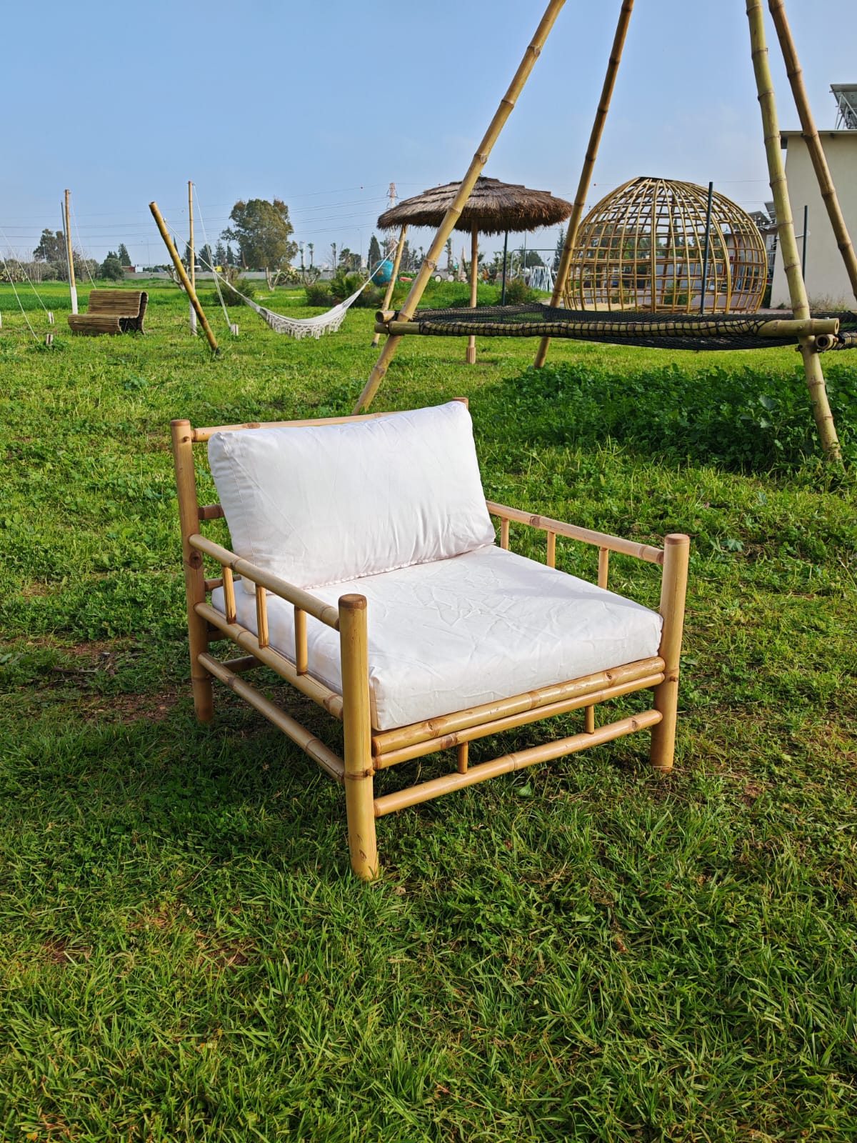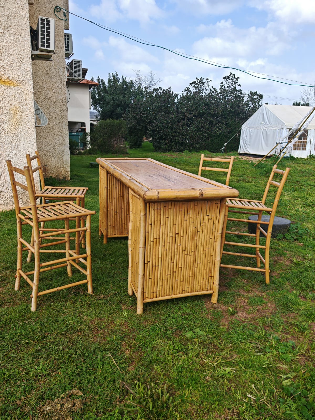 מערכת ישיבה מצדה עשויה מבמבוק טאם וונג האיכותי, בעלת צורה ריבועית בעיצוב כפרי יוקרתי כוללת 2 כורסאות פינתיות ועוד 4 כורסאות מודולריות ושולחן. ניתן להציב אותה במגוון אפשרויות. 4 חלקים מתצוגה 3 חדשים עברה צביעה, יש מעט כתמי טיפות צבע קלים, במצב מעולה, מתאים למקום מקורה מגשם. מידות מזרן כל כורסה: רוחב 72 ס"מ עומק 70 ס"מ המערכת מגיעה עם מזרוני ישיבה וכריות גב, המזרונים והכריות עשויים מבד אקרילי איכותי, נעים ועמיד שמיובא מספרד ונתפרו במיוחד כך שניתן יהיה בקלות לפרק ולכבס כמעט ללא מאמץ. תפירת הכריות והמזרונים בישראל